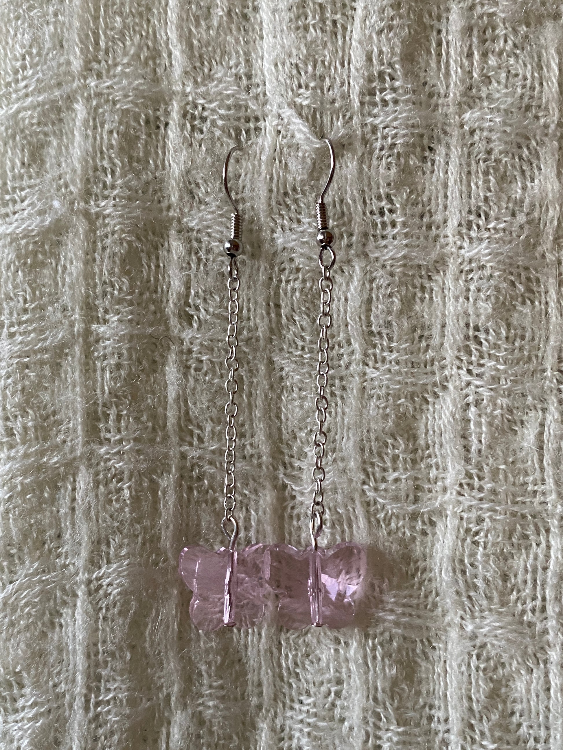 These drop butterfly earrings are the cutest addition to any outfit! The beads are recycled from other broken jewelry and come in four colors: yellow, white, pink, and purple. All the colors have a rainbow aura to them, giving them a colorful shine!
